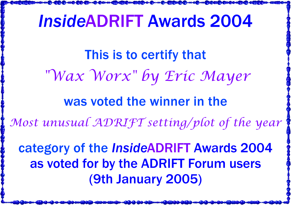 Eric's interactive fiction WAX WORX was voted winner in the "Most unusual Adrift setting/plot" category of the InsideAdrift Awards 2004. It finished second in the game of the year category.
