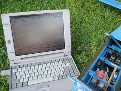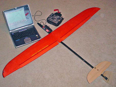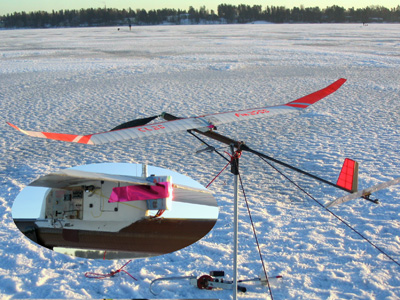 ![]() Tomi Nguyen's Absalut discus launch glider and laptop computer used for uploading flight data in the field. |